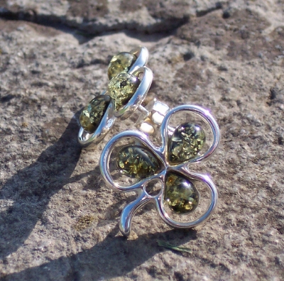 Amber Silver Earrings to stick ES1052g Shamrock picked on St. Patricks Hill and brought from the spiritual heart of Ireland. You can find the mystic past spelt ages ago in the green amber gemstones. Look inside and see the visions of Irish legends. Available for posting in 2 days.